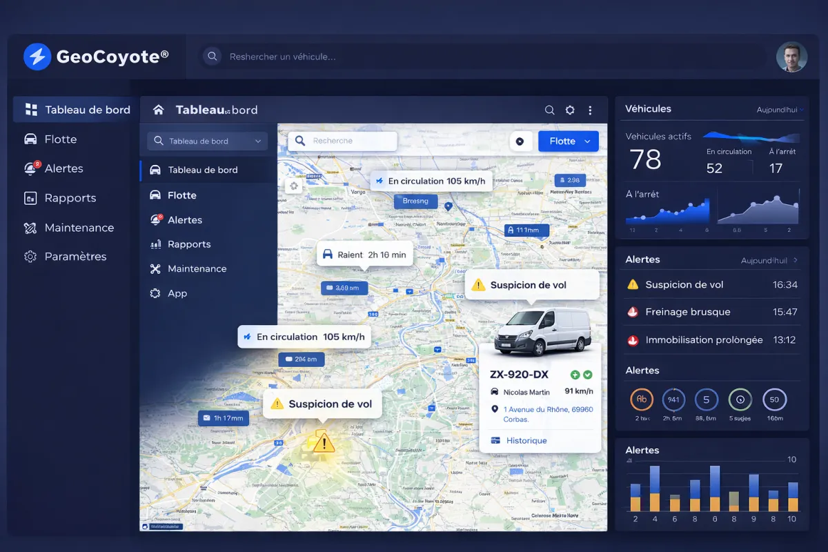 Geocoyote propose un système professionnel en temps réel, développé en France, avec une précision optimale, des alertes intelligentes, et une interface simple à utiliser. C’est une solution conçue spécifiquement pour les professionnels, pas un simple traceur.